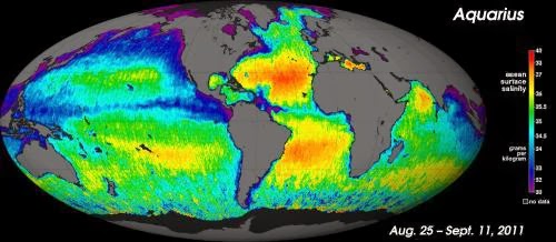 Mapa de la salinidad superficial del mar. Ojo, porque el mapa de antes representaba la variación de la salinidad durante los últimos 50 años. (Fuente)