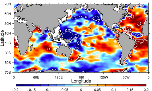 El mar no es uniformemente salino y, de hecho, la cantidad de sal disuelta en cualquier zona del mar varía a lo largo del tiempo. Esta imagen muestra la variación de la salinidad de los océanos desde 1950 hasta el año 2000: